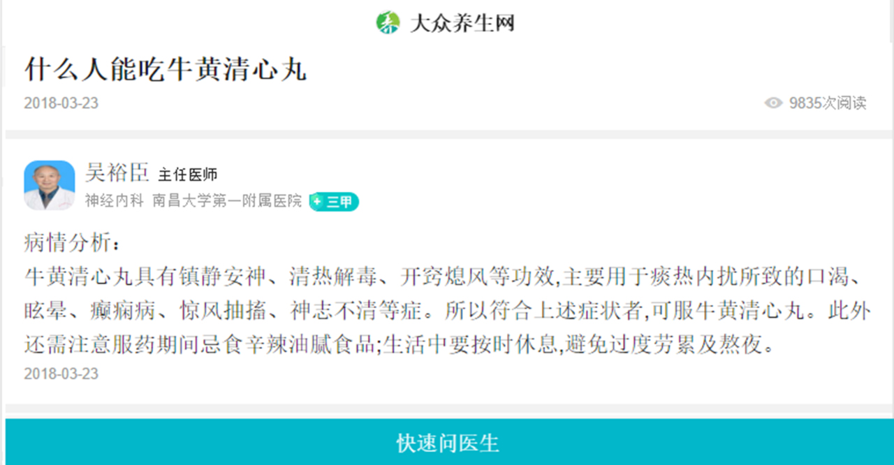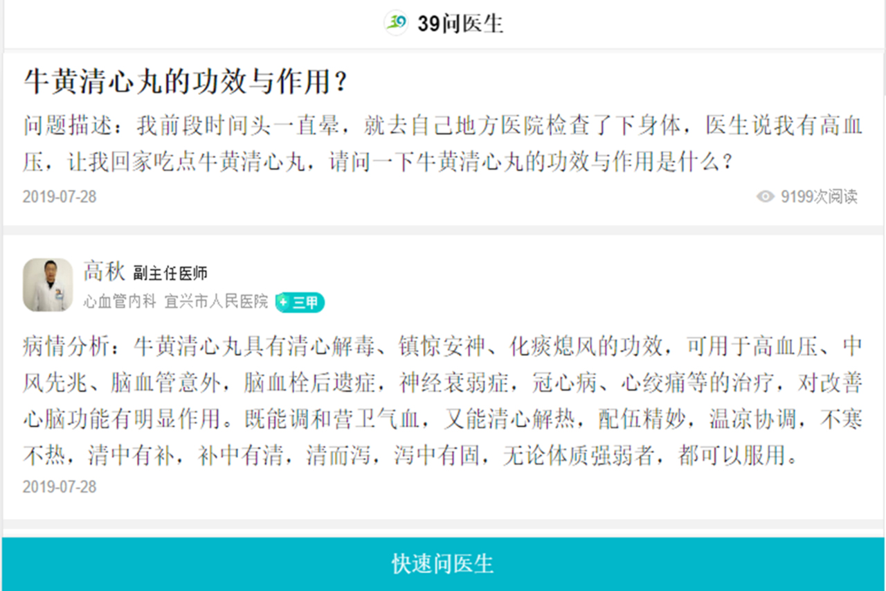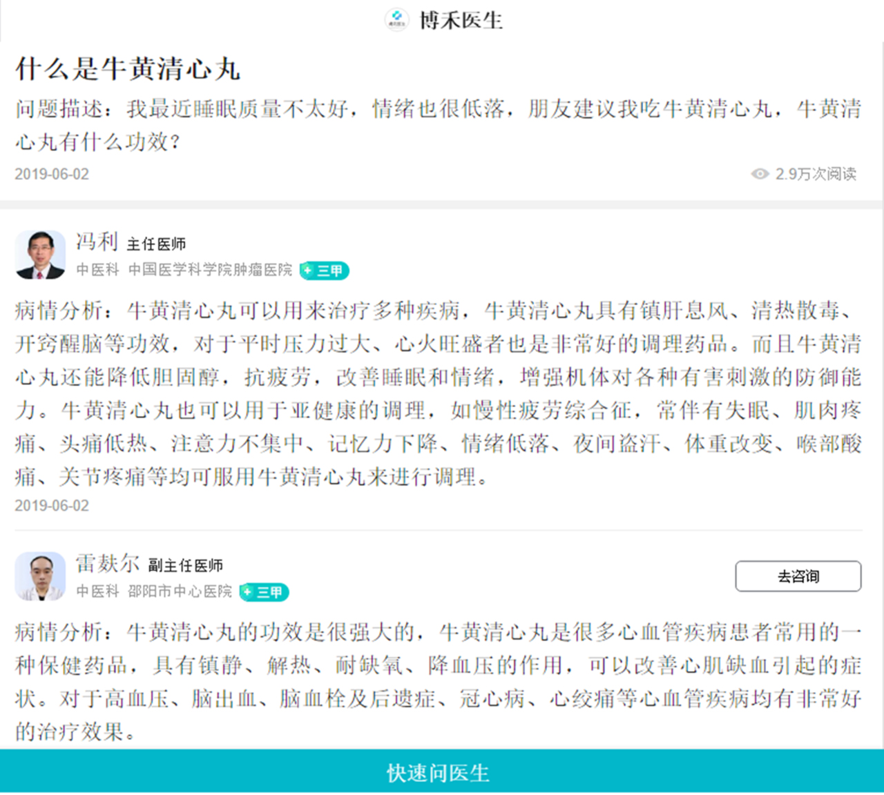 其實每一天在我們的醫療遠程系統里面,全國都會有上千的人來咨詢牛黃清心丸。各位名醫大家遠程去解答大家的問題,為大家排憂解難,為我們的健康保駕護航。尤其是負責牛黃清心丸的解答。下面我們可以看到這些圖片,都是名醫專家在回復咨詢者在咨詢牛黃清心丸。
